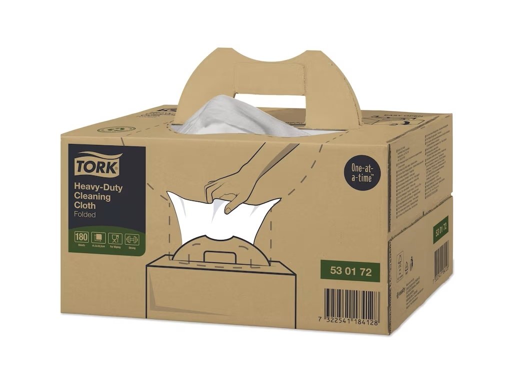 Jednovrstvé Tork Heavy-Duty čistící utěrky jsou pevné a vysoce savé. Lze je použít s většinou rozpouštědel k čistění olejů, mastnoty a tekutin. S technologií exelCLEAN® lze použít až o 41 % méně rozpouštědel než v případě hadrů, což přispívá k zdraví zaměstnanců a také životnímu prostředí.