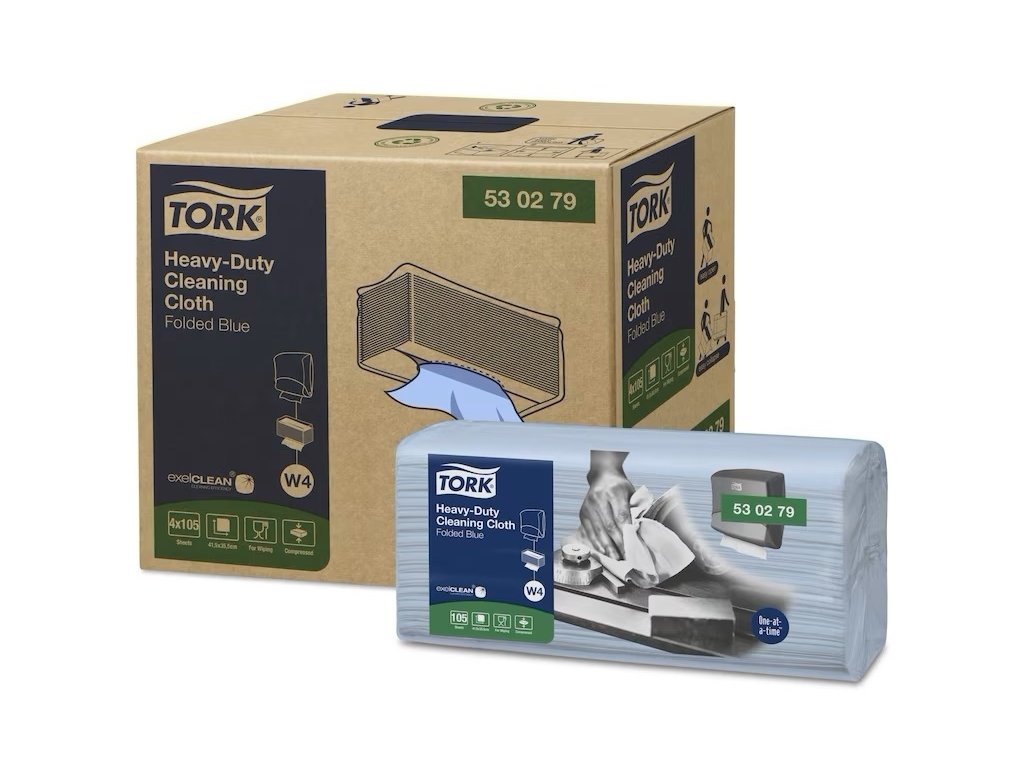 Víceúčelová čistící utěrka Tork Heavy-Duty je vysoce absorpční, pevná a velmi trvanlivá, vydrží hrubé drhnutí, aniž by se roztrhla, navíc je vhodná k opakovanému použití. Funguje v kombinaci s většinou rozpouštědel a rychle a účinně odstraňuje olej, mastnotu, vodu a nepoddajné skvrny a chrání přitom ruce před horkem a kovovými úlomky. Utěrky se dodávají v balení Tork Easy Handling®, které umožňuje rychlé a snadné přenášení, výdej po jednom kuse minimalizuje plýtvání. Obal je navíc z recyklovaného materiálu. Utěrky lze použít s Tork zásobníky na skládané utěrky W4.